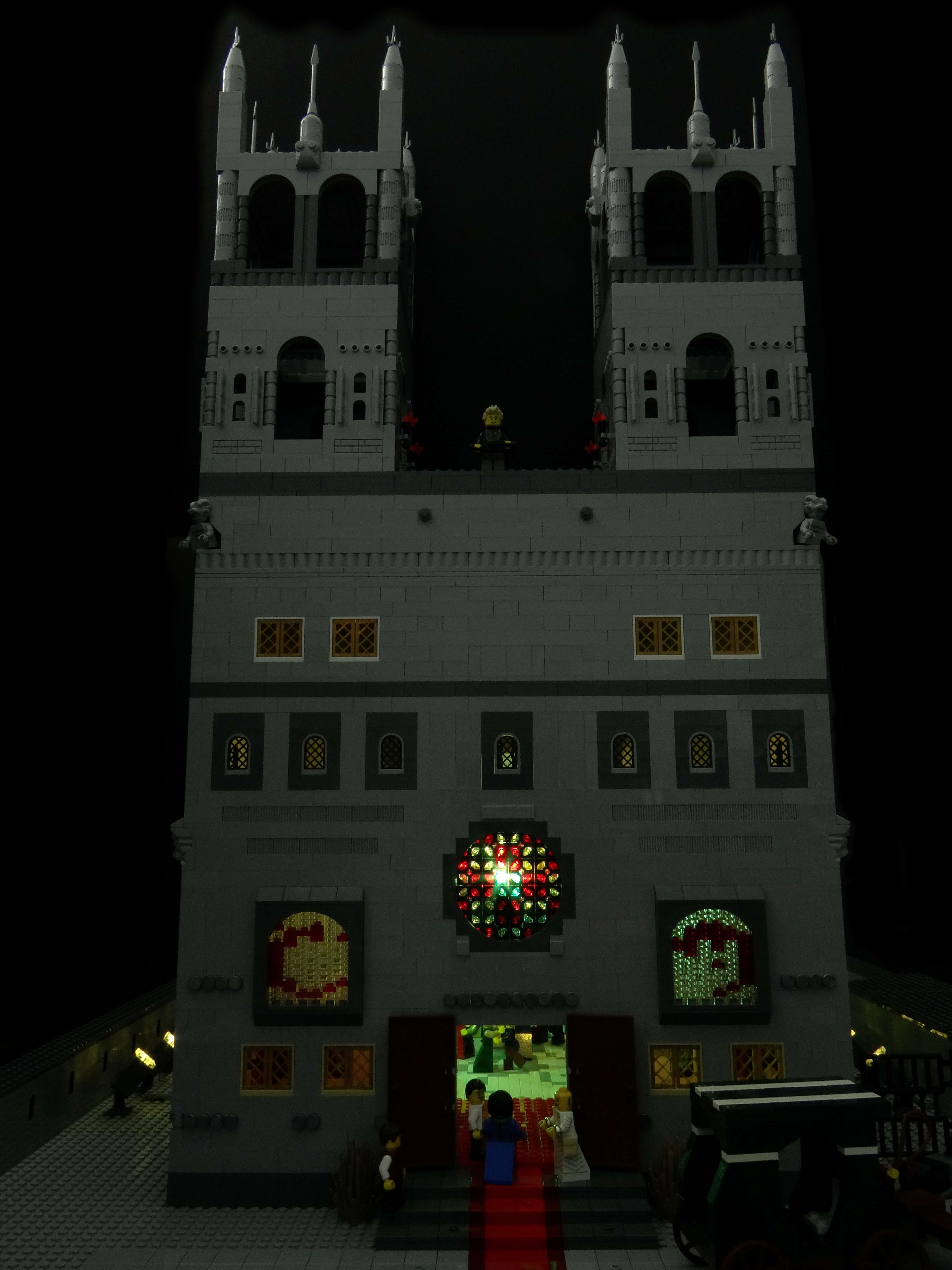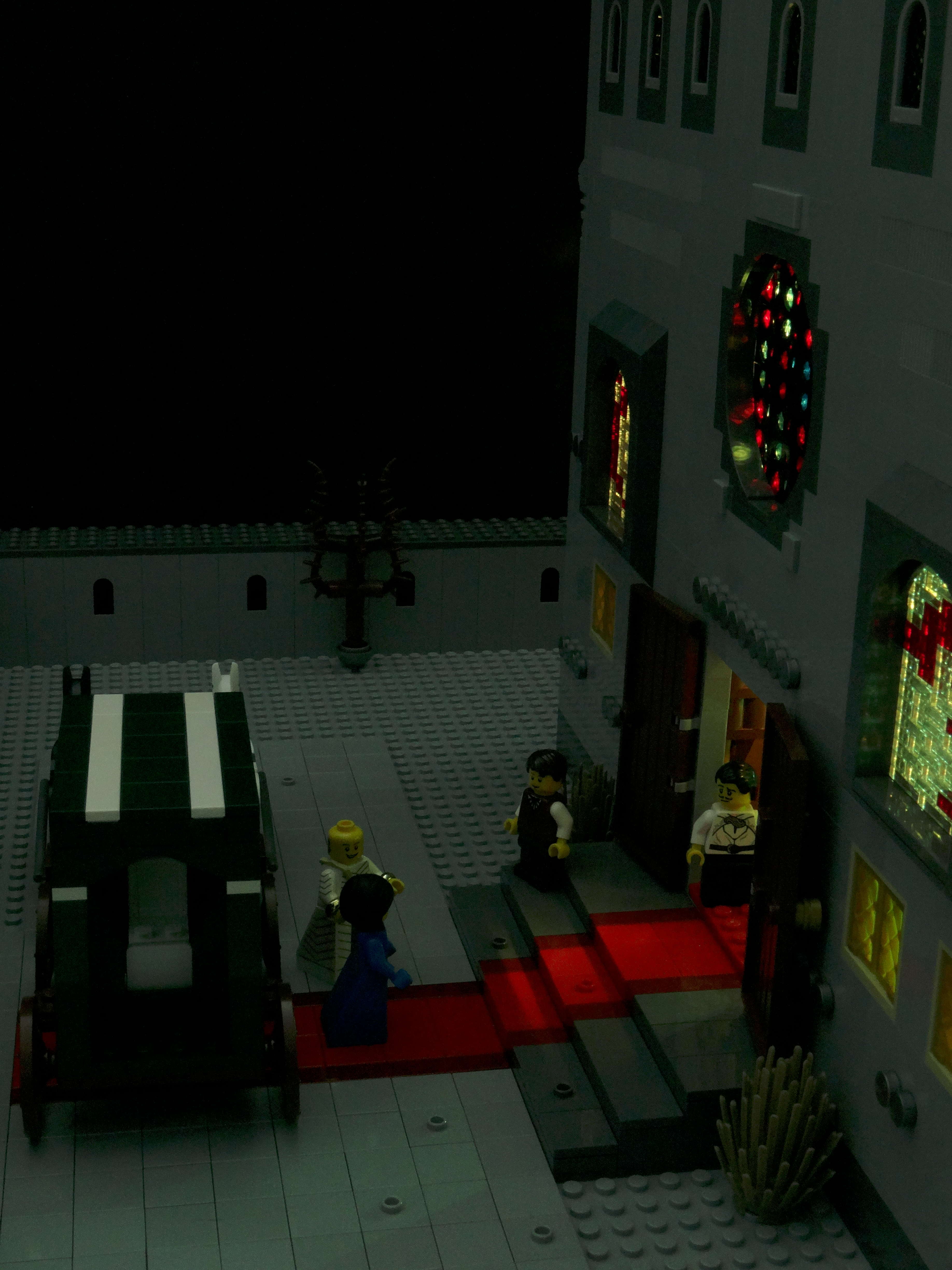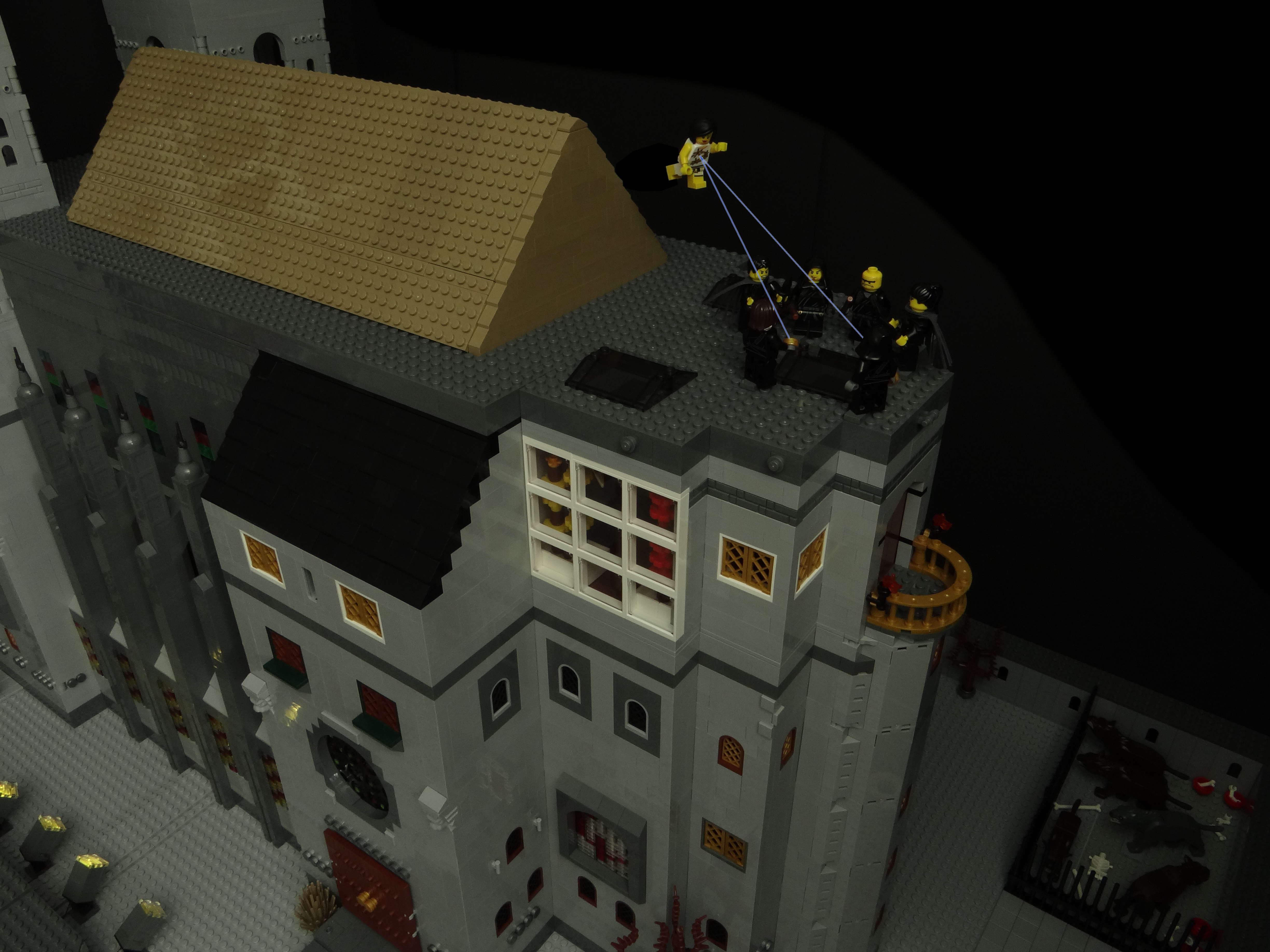 In one of his annotations (warning: spoilers for Hero of Ages), Brandon says that the architecture of Keep Venture is based off of the Washington National Cathedral. I did my best to mimic that on the Keep's exterior, with a few modest changes due to running out of grey bricks and table space. The build itself was tricky because I had to allow for large portions of the walls and roof to be removed for photography, without disturbing the interior wiring used for the lighting. That is why you only see interior lighting on one side of the main hall above the dance floor -- the wall on the other side was occasionally removed.